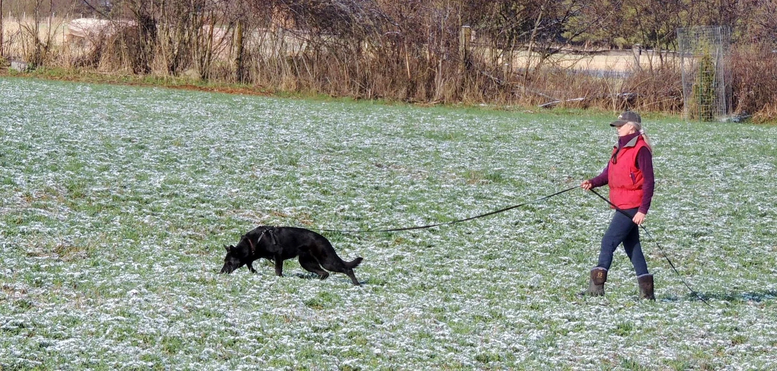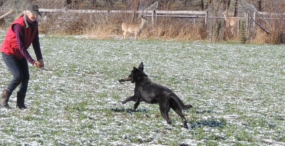 A little play retrieve after tracking, ignoring the deer in the background