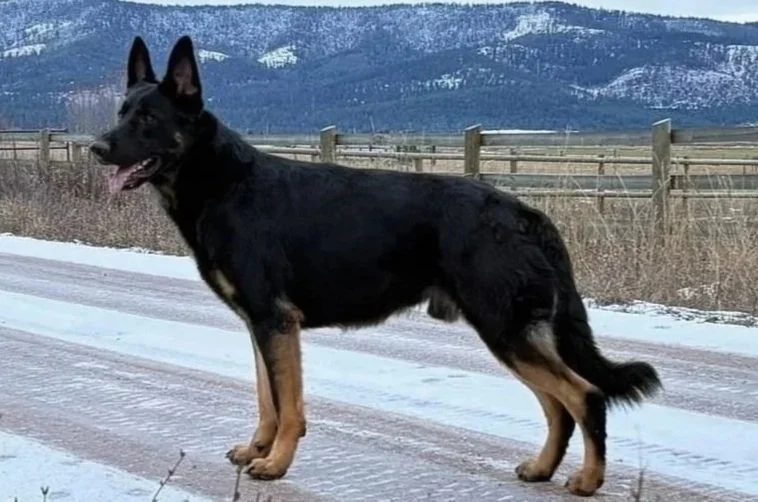 • INDIGO of SAPPHIRE MOUNTAIN (photo taken spring 2025 at 13 months of age). OFA Preliminary Rated Good / Normal / Full Dentition / DM Carrier. FITB, ACT 1, VSWB, TKN, ACT 1J, currently training in tracking. Indigo is a very driven, active, strong female.
