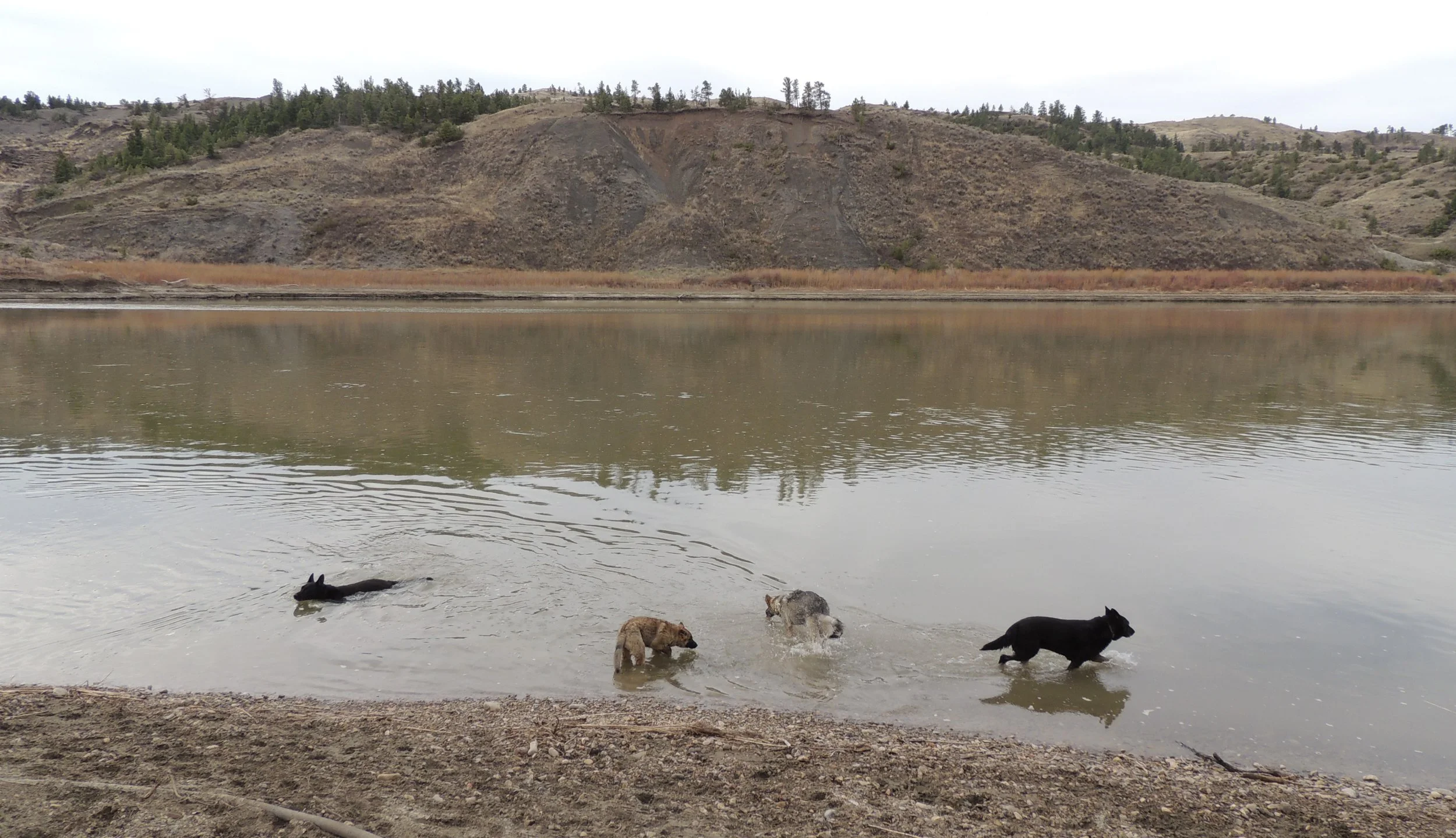 In eastern MT with a group of our breeding stock, Xurk far left swimming in the Missouri river.